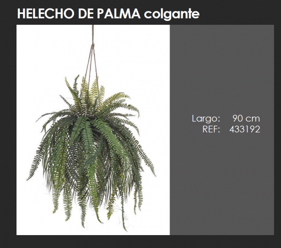 Helecho de Palma colgante de alto realismo. Altura total aproximada de 90 cm. No requiere