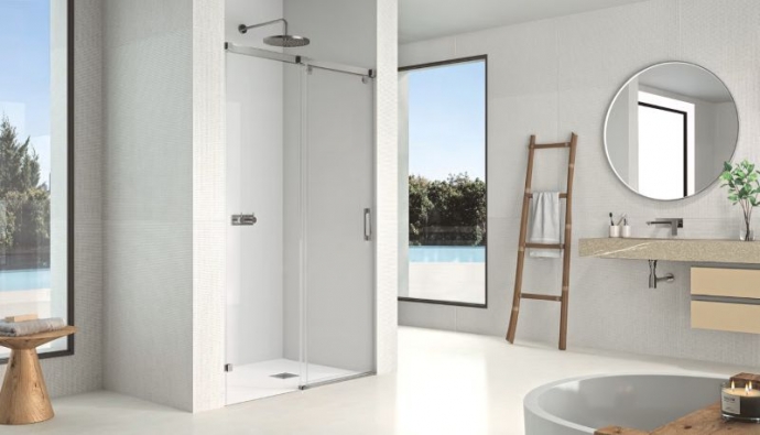 Mampara de ducha frontal de una hoja corredera y una hoja fija, sin perfiles laterales ni inferior. Además,