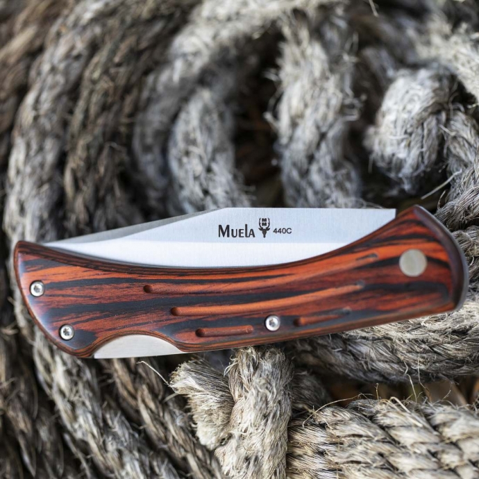 de la hoja, estilo "clip point", consiguiendo transmitir la esencia del alma Muela: calidez y autenticidad, junto a precisión y resistencia.