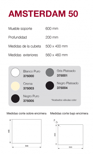 Fregadero modelo Amsterdam 50 para encastre o bajo encimera en 5 terminaciones de color