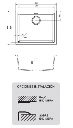 Las medidas exteriores del fregadero son: 56cm de ancho x 46cm de fondo x 20cm de alto.