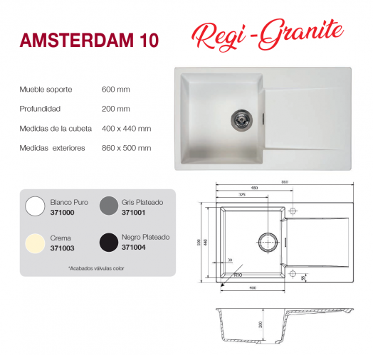 El fregadero de cocina Amsterdam 10 se puede instalar encastrado sobre encimera en muebles a partir de 60 cm.