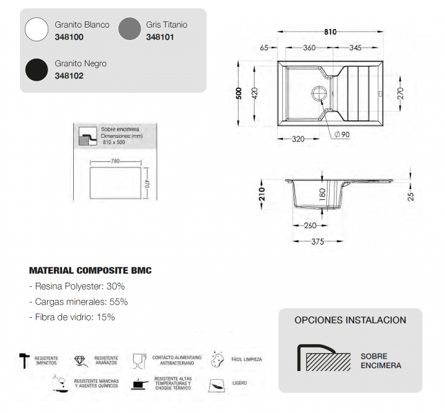 Disponible en acabados granito blanco, gris titanio y granito negro, se adapta fácilmente a distintos estilos de cocina. Incluye válvula en el precio.