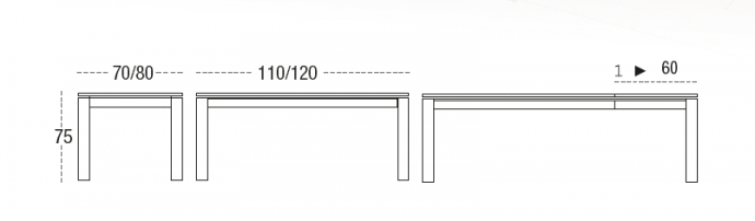 Mesa extensible con apertura lateral mediante desplazamiento de patas con ruedas.