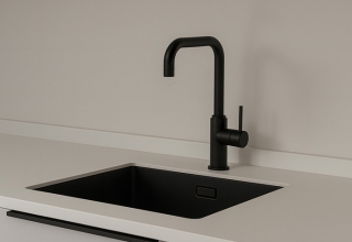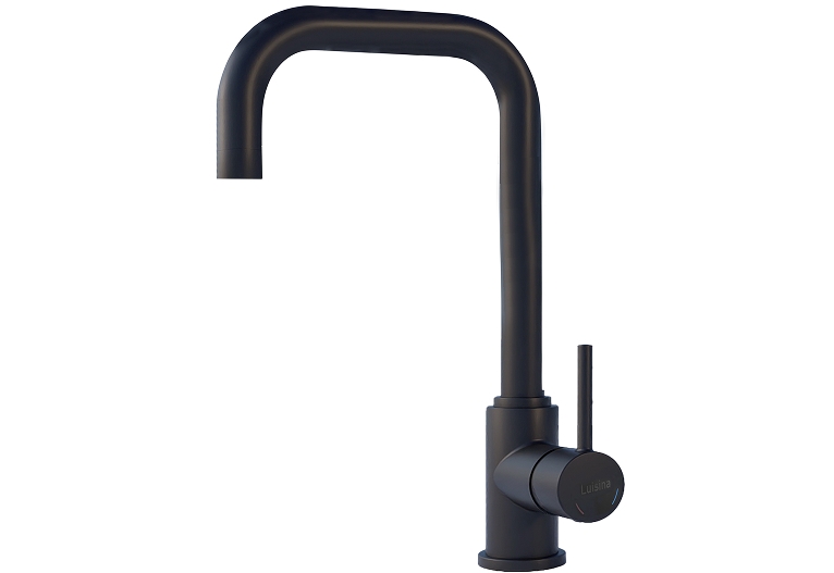 Grifo monomando con cabezal fijo y un diseño ligeramente curvo, disponible en acabado cromo o negro