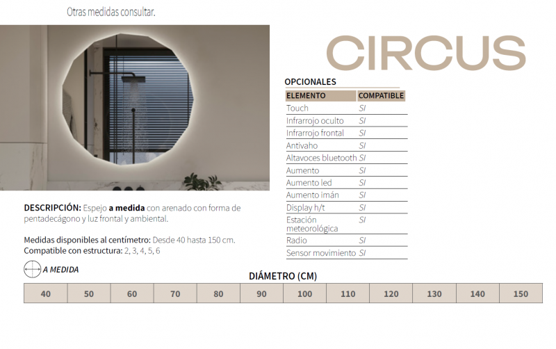 Espejo a medida con arenado con forma de pentadecágono y luz frontal y ambiental
