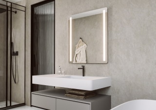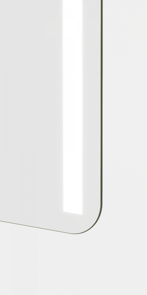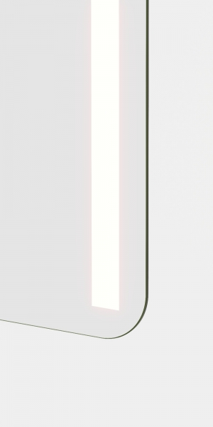 Espejo a medida con cantos redondeados (R50) con franjas arenadas de 30mm en los laterales y luz