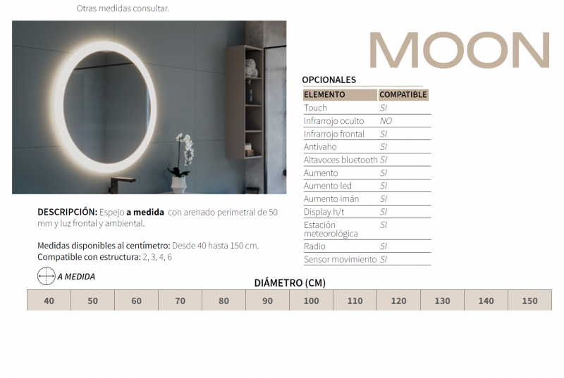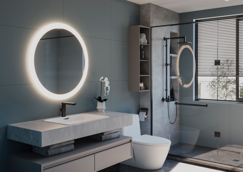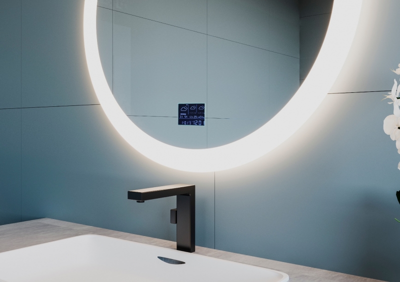 Espejo a medida con arenado perimetral de 50mm y luz frontal y ambiental
