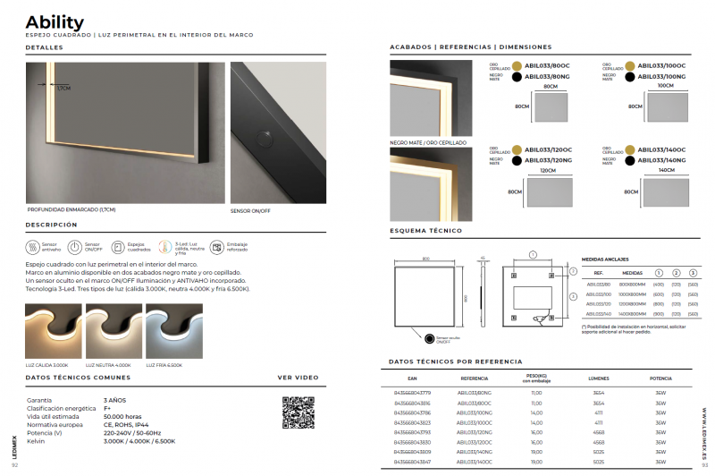 Incorpora anti-vaho y sistema de encendido mediante sensor oculto en el marco.