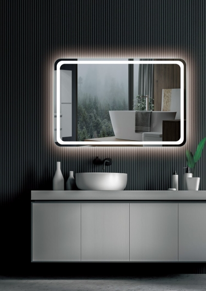 Espejo de baño de diseño contemporáneo, caracterizado por su formato cuadrado con cantos redondeados que aportan suavidad visual y