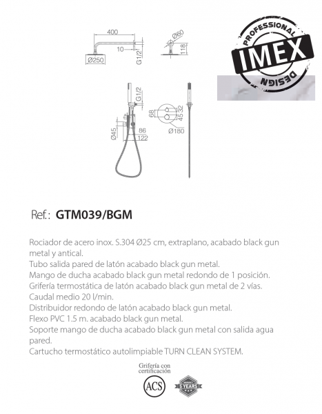 Grifería termostática de latón black gun metal (PVD) de 2 vías.