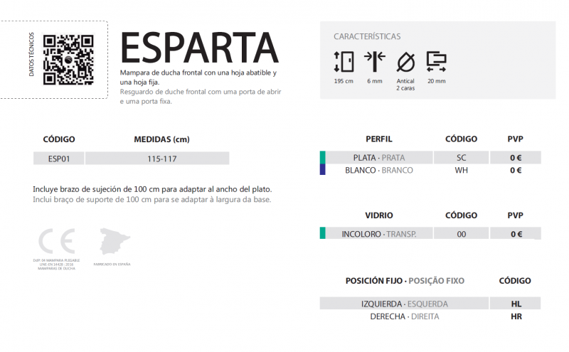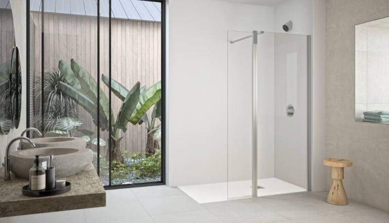 Mampara de ducha frontal de una hoja fija y una hoja abatible.