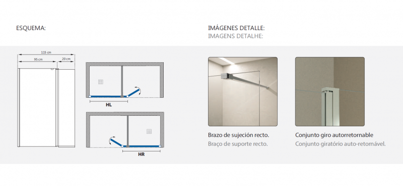 Mampara de ducha frontal de una hoja fija y una hoja abatible, con perfiles de compensación de 15 mm