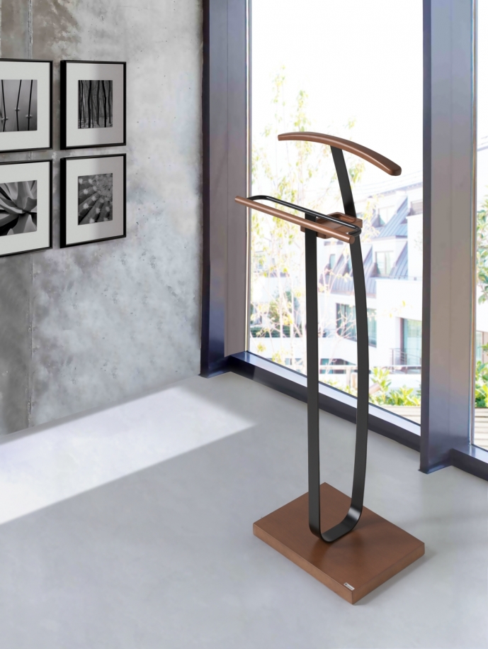 El galán de noche de 369 Herdasa combina diseño, calidad y practicidad. Con una altura de 111 cm y un ancho de 46 cm, este perchero está fabricado en madera de alta calidad, disponible en acabado chapado natural o lacado, lo que garantiza durabilidad y un estilo sofisticado.