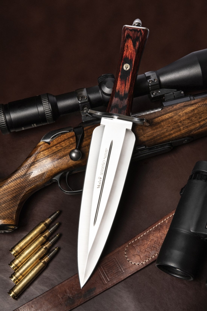 La empuñadura de este cuchillo / daga de remate sigue siendo de madera prensada coral (palo rojo), y su hoja, de doble filo, en acero X50CrMoV15 (MOVA) con dureza de 57-58 HRC.